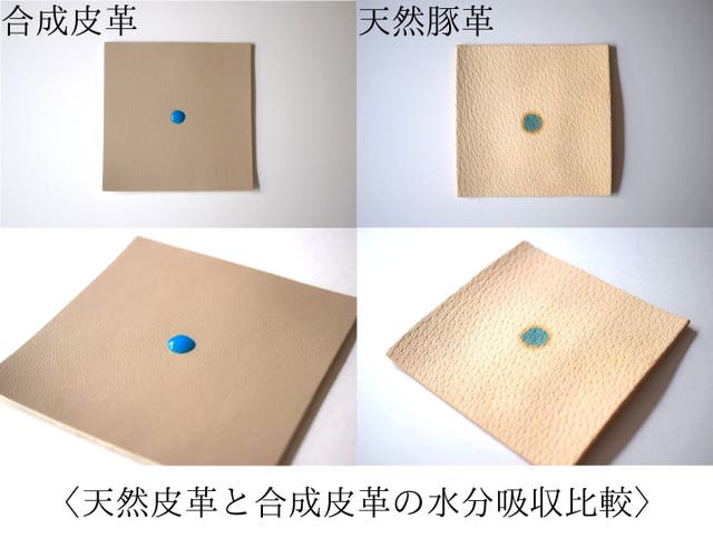 皮革を構成するコラーゲン繊維は高親水性で、合成繊維に比べて革は圧倒的に多くの水を吸水します。