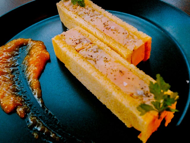 3.高級食材フォアグラのテリーヌのサンドイッチ。金柑ソースを添えて