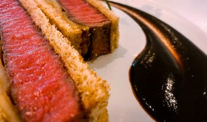 5.和牛ローストと林檎のソテーのサンドイッチ。赤ワインと黒にんにくソースを添えて