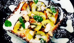 季節のフルーツをバターの香りが特徴の自家製ブリオッシュトーストに乗せて適度に焦げ目をつけ、仕上げにホワイトチョコレートをかけます。サクッとした歯ごたえから始まり、オーブンで熱を入れたフルーツの柔らかい食感と温かい甘みが広がり、ほんのりとホワイトチョコレートの風味が幸せな余韻として続きます。