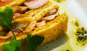 ハンガリー産のフォアグラにゆっくりじっくりと火を入れ続け、形を整えてテリーヌにします。サンドイッチに使うパンは、水を一切使わずにバターとミルクをたっぷりと使い、バターの香ばしい香りがいっぱいに広がる自家製ブリオッシュ。合わせるフレンチソースはフレッシュで果実感あふれる金柑のソース。テリーヌ型に封じ込めた冷製フォアグラのこってりまろやかな味わいを爽やかにまとめあげています。