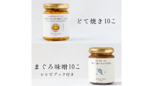 どて焼き5個と、焦がし鮪のおかず味噌(レシピブック付き)5個と、小分け袋10枚(ラベルシール付き)のセットとなります。