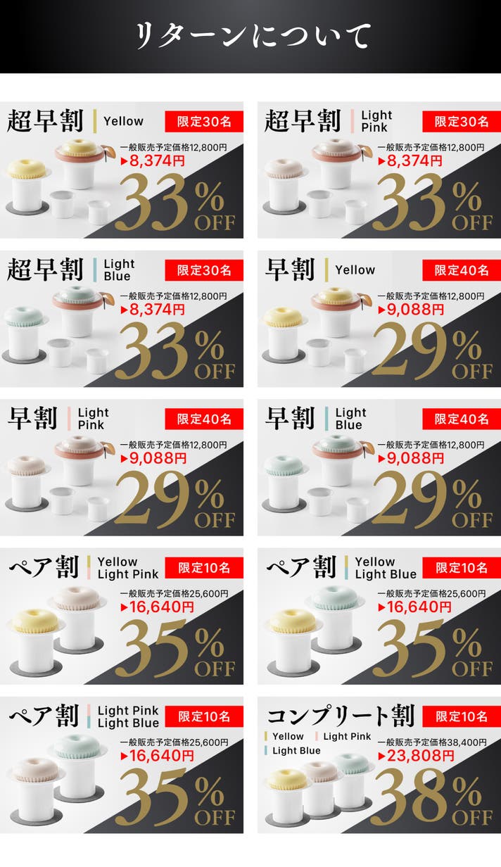 ▼ ご購入前に必ず内容をご確認ください▼ ・商品の色味は、ご覧のモニター環境や撮影状況により実物と異なる場合がございます。 ・期間中も製品向上のためデザインや仕様に、改良や一部変更箇所が発生する場合が御座います。 ・並行輸入品が発生する可能性があります。正規以外での個人輸入等は、完全に防ぐことができない場合がございます旨、予めご了承のほどお願いいたします。 ・並行輸入品は正規代理店による製品保証を受けることができません。 ・また、正規代理店を通じて購入することで、日本国内での流通に必要な各種認証の取得や、関税などの適切な処理が担保されます。 ・本文中に記載させていただいたスケジュールは、あくまでプロジェクト公開時点の予定です。応援購入の性質上、配送遅延のおそれがございます。 ・流通や世界情勢、注文数、天候、生産工程の都合等により、発送予定時期が遅れる場合がございます。できる限り早くお届けできるように努めて参ります。最新の状況はMakuakeの活動報告にてお知らせいたします。 ・原則として、配送遅延に伴う応援購入のキャンセルはできませんが、リターン配送予定月から3ヵ月を超えた場合には、希望者に限りキャンセルにて対応させていただきます。 ・使用感などについては個人差がございます。そのため、初期不良を除き、お客様都合による返品・交換はお受けできかねませんので、ご了承のほどお願いいたします。 【返品・交換をお受けできない商品】事前にご連絡をいただいていない商品 ・発送完了のご連絡は行っておりません。Makuakeの活動報告をご確認ください。 ・保管期限超過、住所不明などにより弊社へ返送された場合、再送には手数料・送料(1,500円)が発生いたします。 ・全国一律送料込みです。(沖縄・離島含む) ・想定を上回る応援購入を頂き生産体制を更に充実させることができた場合、正規販売価格が販売予定価格より下がる可能性がございます。 ・一部国内で類似商品が出回っている場合がございます、弊社では他社の類似品に関してのお問い合わせには対応出来ませんのでご了承下さい。 ・インボイス対応可(適格請求書発行事業者登録番号あり) ご希望の方はMakuakeのメッセージでお問い合わせください。 ・万が一ご使用中にお気づきの点がございましたら、些細なことでもお気軽にお問い合わせください。スタッフ一同、誠意をもって対応させていただきます。