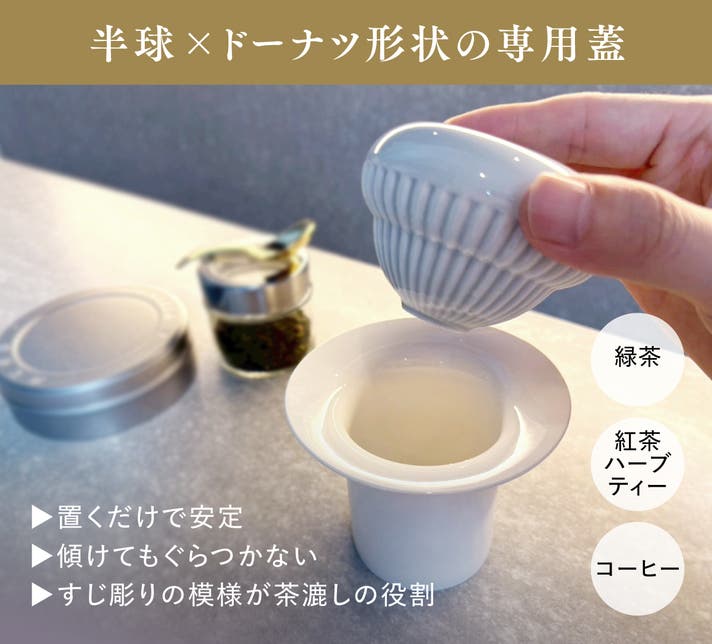 蓋にはすじ彫りの模様が施されていて、細かい隙間から液体だけが流れ出し、茶漉しの役割も果たします。