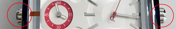 それぞれの時間を合わせるためのリューズはそれぞれ左右に配置されています。