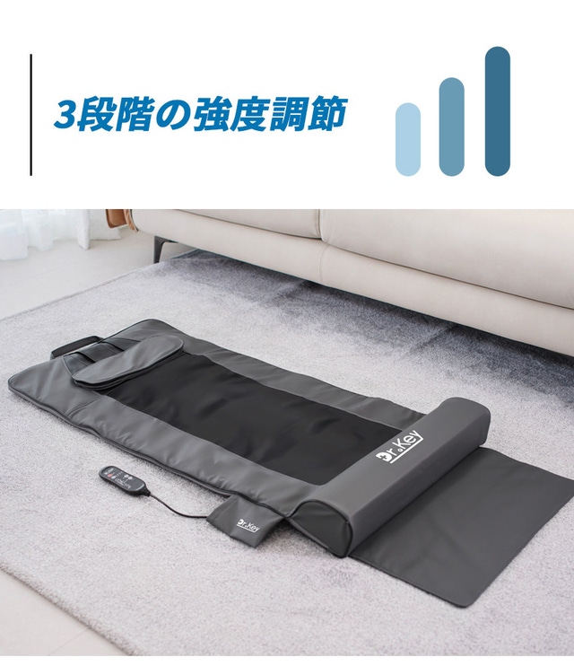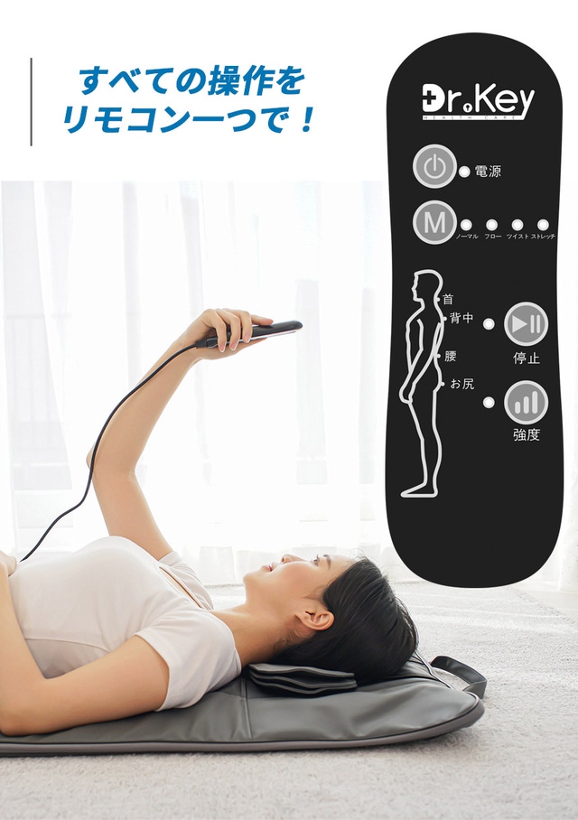 ただじっと横になり気軽にケアを受けられるなんて、手軽な方法ですね! 骨盤、背中、腰をやさしくケアしながら、家で手軽に、極上のひとときをご堪能いただけます。 マッサージチェアは大きすぎて場所を取るし、値段が高くてなかなか手が出せないという方には、こちらのストレッチマットが大変お勧めです。Dr. KEYのストレッチエアマットは、折り畳んで保管でき、スペースをあまり取らないのも魅力的です。ぜひこの機会をお見逃しなく!