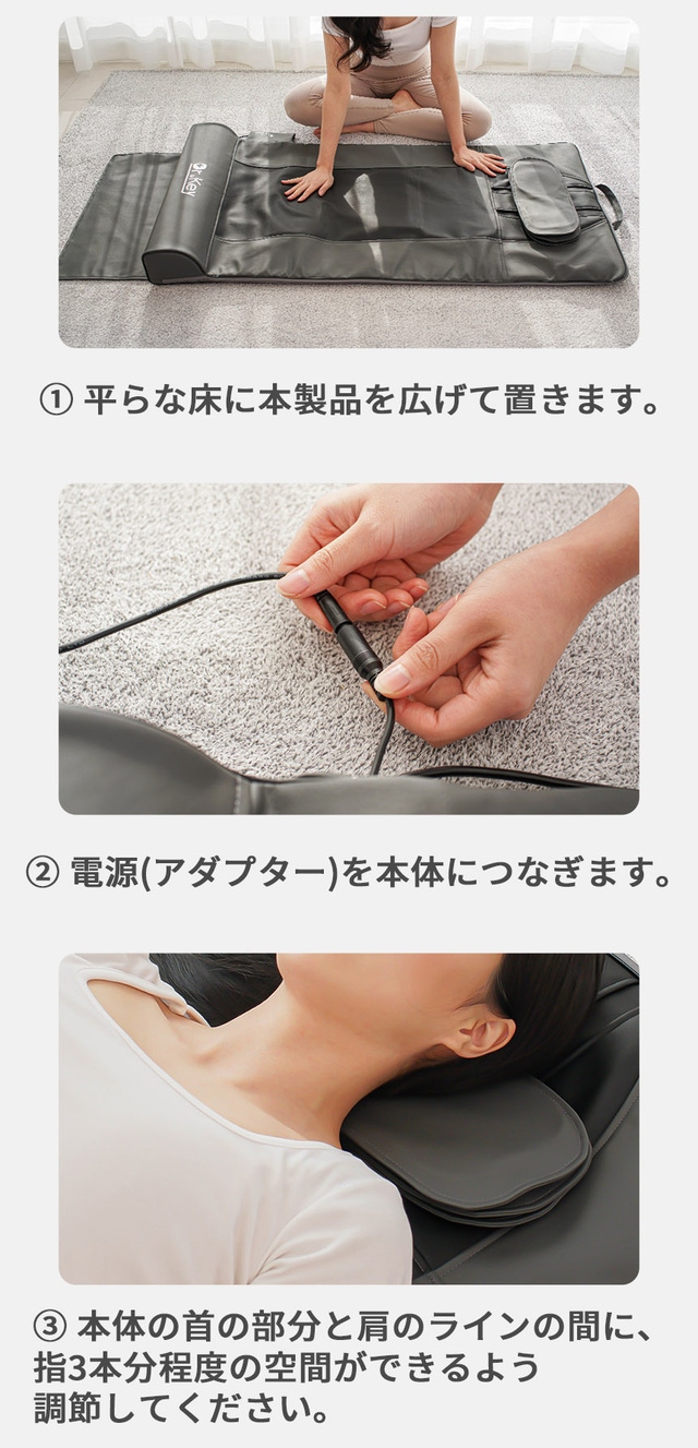 1. 本製品は首、肩、背中、お尻、腰椎部位をケアするためのもので治療目的で使われる医療器具ではありません。