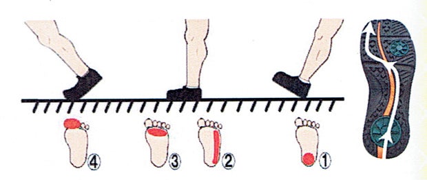 踵から着地する時にかかる膝への衝撃を大小2つのはだしコンダクター(8枚ハネ)が、スクリューの機能をし、衝撃を分散、膝への負担を緩和。