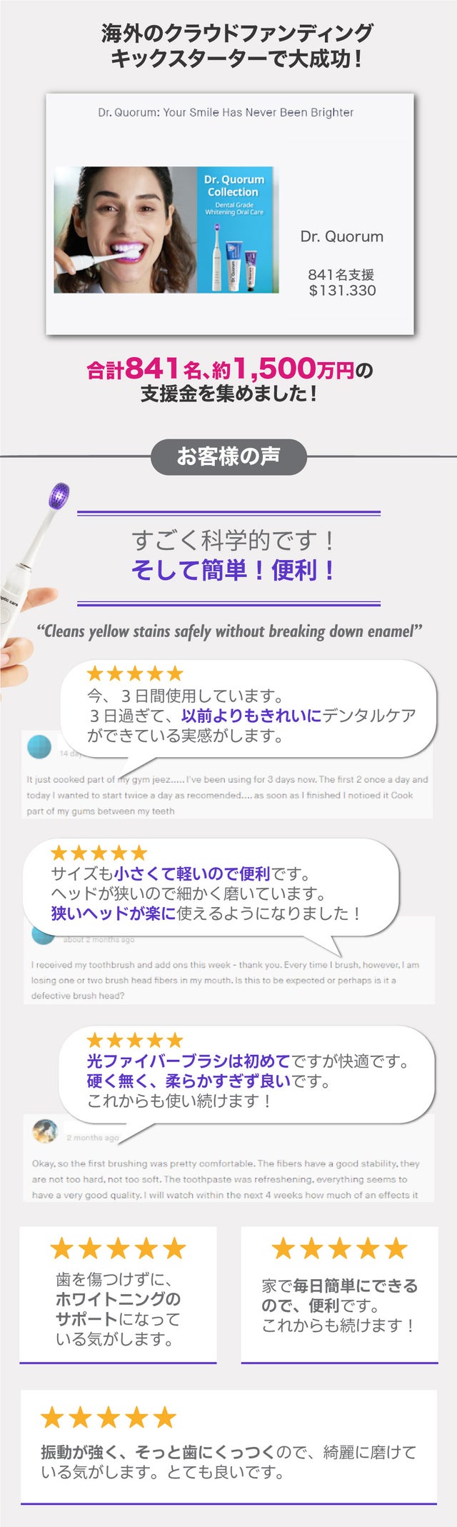 既にアメリカではクラウドファンディングを経て、多くの人気を集めている製品である、Dr. Quorum電動歯ブラシを今回Makuakeにてご紹介させていただくことになりました。