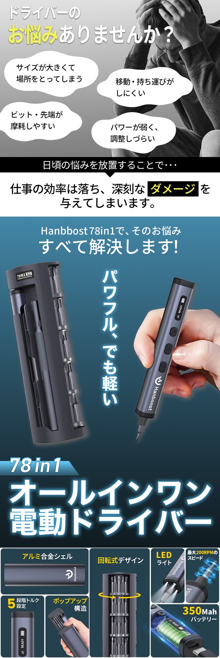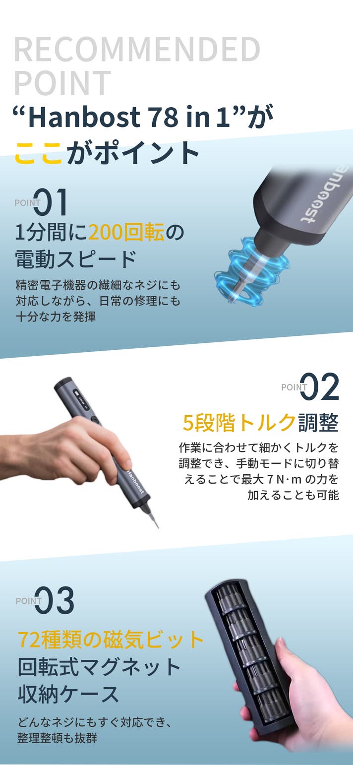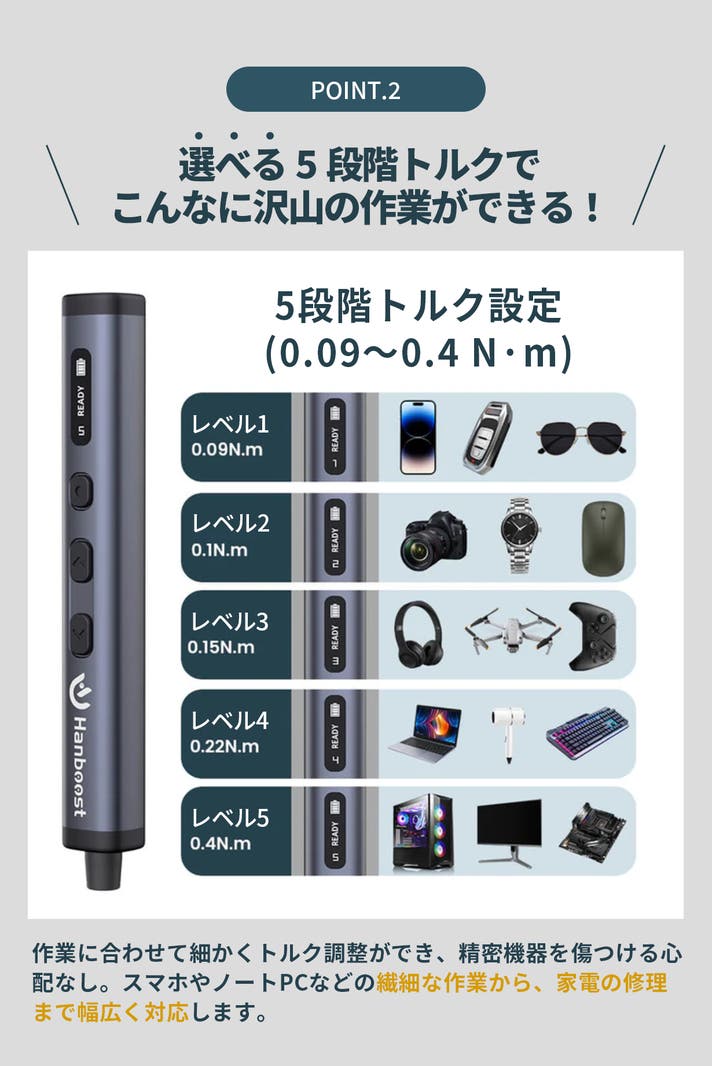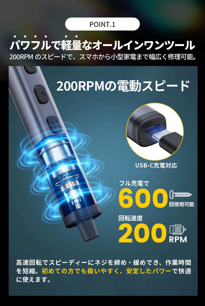 - 精密から日常修理に:5段階トルク調整と200RPMのスピードで、スマホから小型家電まで対応。