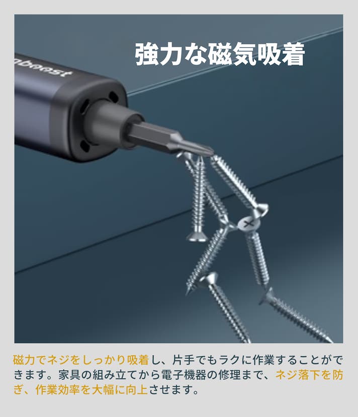 200回転/分の高速モーターと5段階トルク設定、磁気ビットを備え、ユーザーの作業効率を大幅に向上させます。