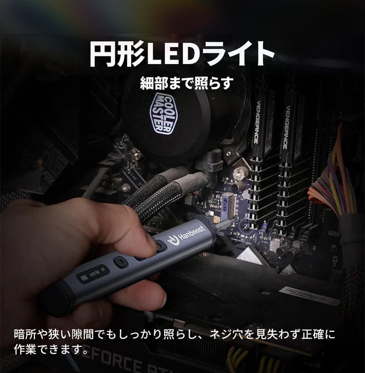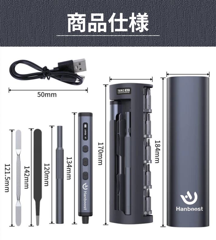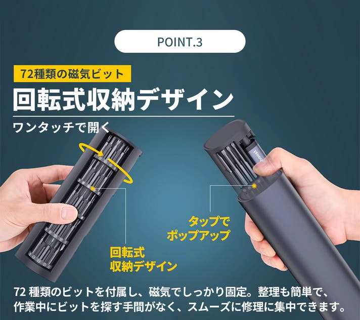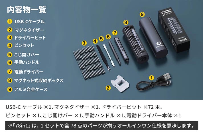 - 便利でスタイリッシュな設計:LEDライトと回転式マグネット収納ケースで、暗所でも修理を実現。