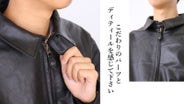 スライダーはちょっと大きめの8号サイズで革になじみの良いアンティークゴールド。ジップヘッドは開閉しやすいようにレザーの引手を付けました。ドリズラージャケットの特徴である襟元にはチンストラップを採用。