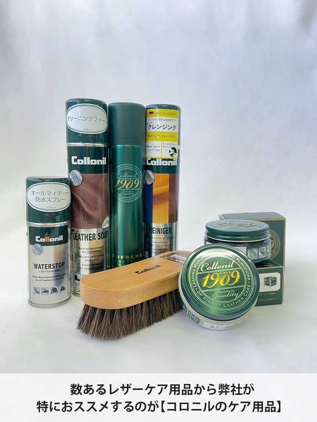軽いケアにはブラシ、防汚には防水スプレー、汚れ落としにはムースやスプレー、補色には同色のクリームを。全てレザー専用のケアグッズを使用して下さい。