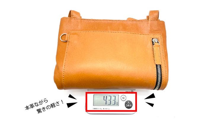 本革は重いイメージがあるかもしれませんが、『ZATTOレザーバッグ』は薄く軽い革を採用。そのため、本革ながら約440g前後と嬉しい軽さです。そして裏地が必要ない加工により、軽量に仕上がっています。(革の厚みは均一ではないため、すべて同じ重さではありません。)