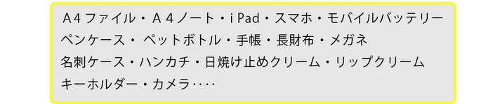 ざっくり持つための容量はビジネスや通学に必要なA4ファイルがちゃんと収まって、趣味や買い物にも対応できる容量。