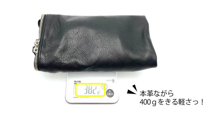 本革は重いイメージがあるかもしれませんが、『本革POKEショルダー』は薄く軽い革を採用。そのため、本革ながら約400g前後と嬉しい軽さです。そして裏地が必要ない加工により、軽量に仕上がっています。(革の厚みは均一ではないため、すべて同じ重さではありません。)