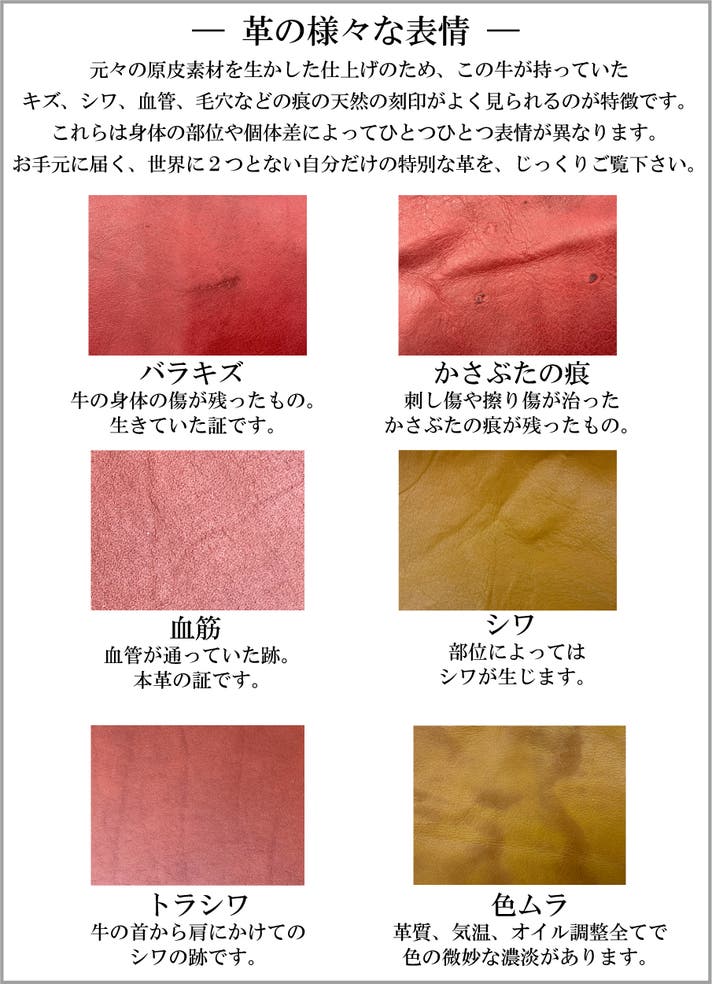 デッドストック革の解消を目的としているため、キズやシミ、色むらなどがございますが、あえて避けずに余すことなく使用いたします。