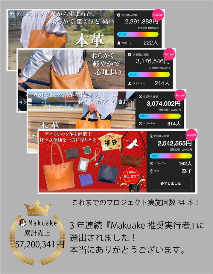 2021年に『本革製品福袋』から始まったデッドストック革を救うプロジェクトは、これまでたくさんのプロジェクトを実施してきました。そして現在3年連続Makuake推奨実行者に選出いただき、本当に感謝の気持ちでいっぱいです。