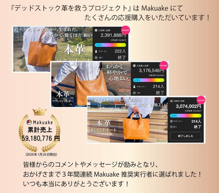 2021年に『本革製品8点セット福袋』から始まったデッドストック革を救うプロジェクトは、今では3年連続Makuake推奨実行者に選出いただき、本当に感謝の気持ちでいっぱいです。