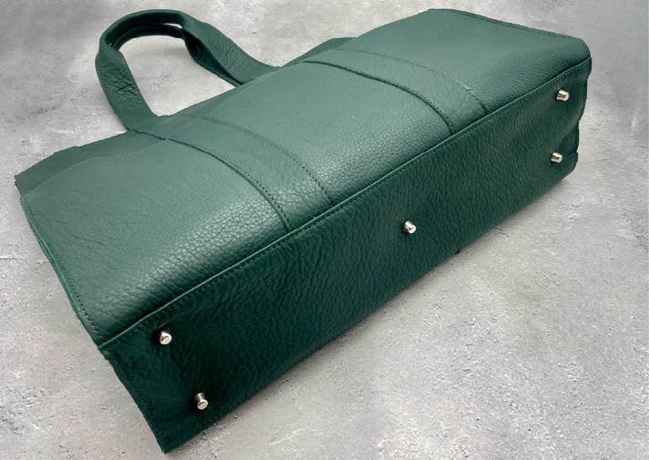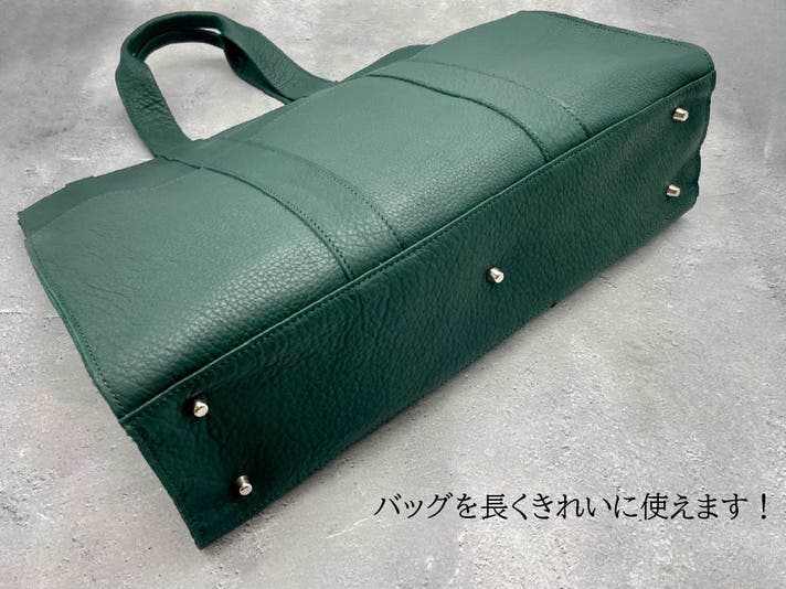 バッグを床や地面に置いた際に、底が汚れてしまったり擦れてしまうことを軽減してくれます。実用性だけでなく、デザインの一部としても高級感を高める効果があります。