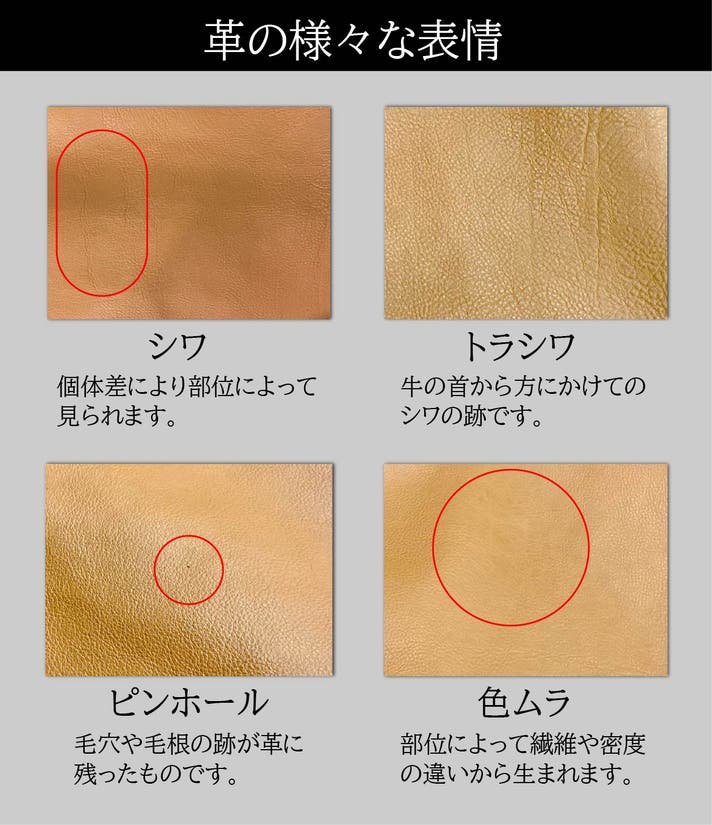 本製品は天然皮革素材を使用しています。その為、摩擦、汗、水分等の外的要因によって色移りが発生する可能性がございます。革本来が持つ色ムラ、キズ、シワ、血筋等が見られます。天然皮革素材ならではの個性としてご理解ください。モニター環境により、実際の商品の色合いと異なって見える場合がございます。