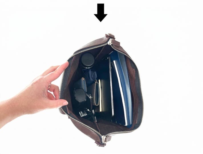 肩掛け・手持ち・机置き、どの持ち方でもサッと中身を取り出せる。