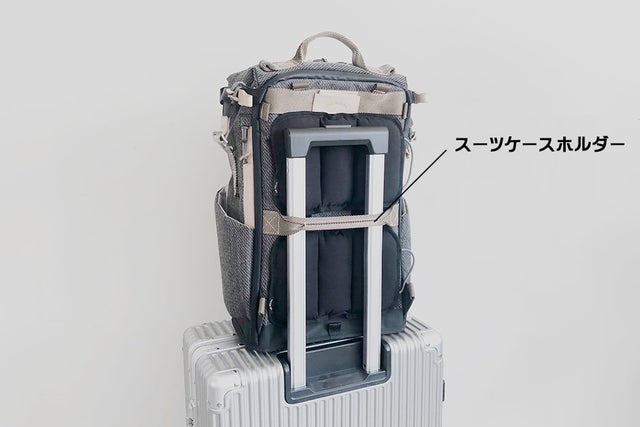 カメラ三脚もアウター収納スペースに入り、バッグベルトでホールドが出来ます。