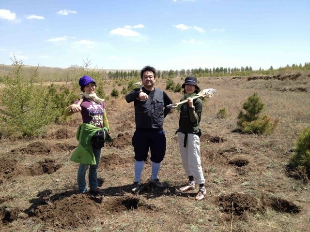 (内モンゴル武川県の植樹現場にて。一般社団法人地球緑化クラブ代表・原鋭次郎氏とともに。2014年5月)