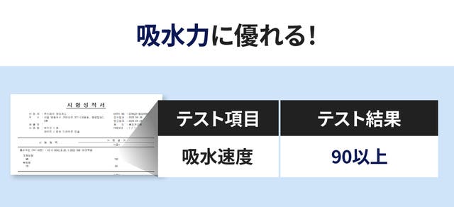 通常は80以上であれば優秀であると言われる吸水速度が90以上を記録し、優れた吸水力であることが認められました。