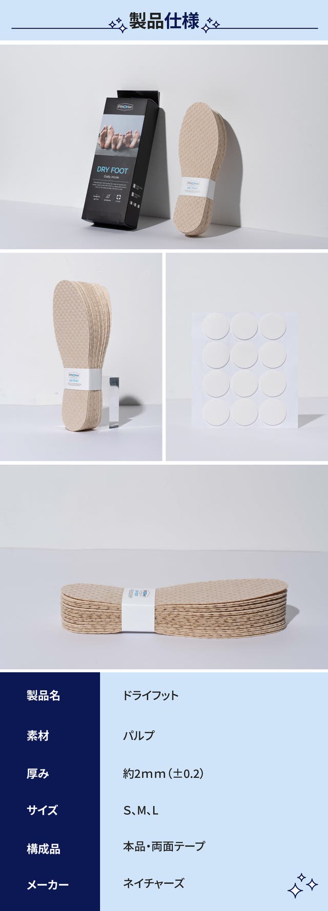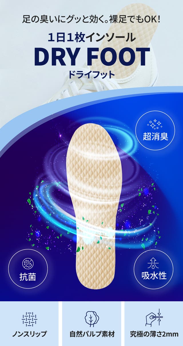 ドライフットは自慢の吸水力であなたの足から出る汗を即座に吸収します。