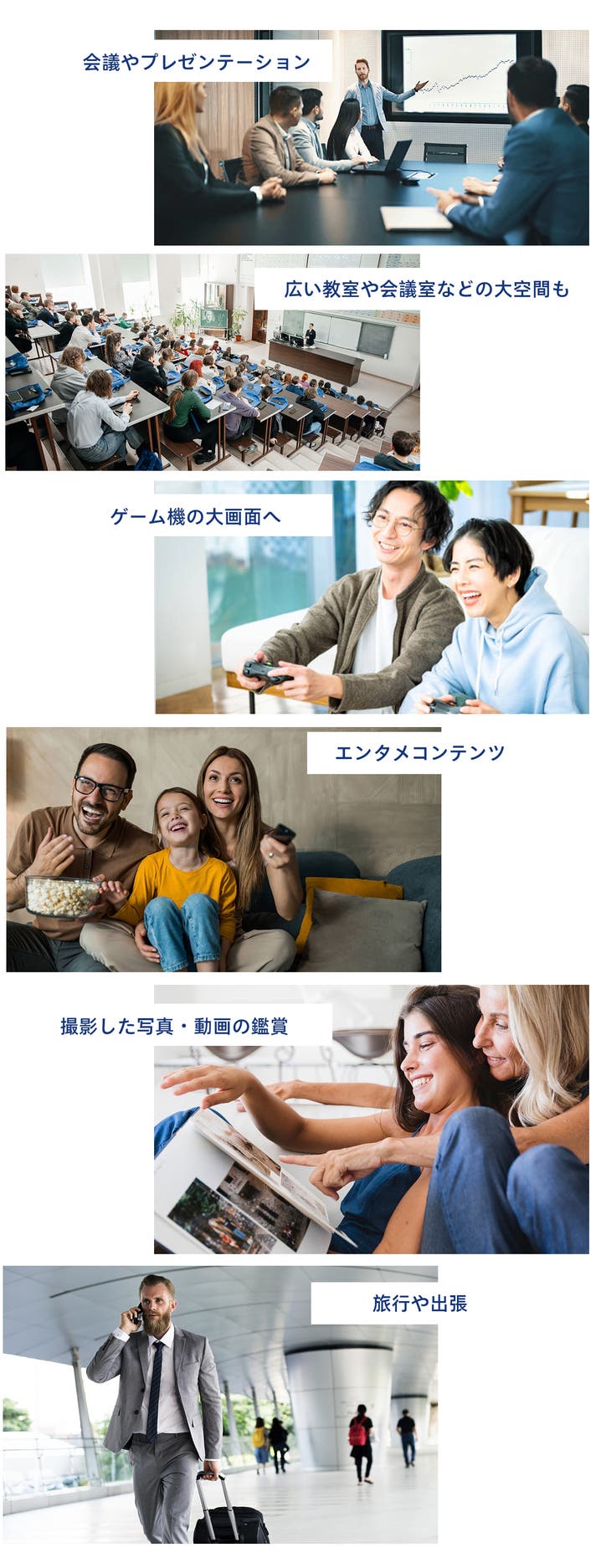 - 面倒な配線もWi-Fiも一切不要。会議・旅行・ゲームなどあらゆる場面を完全ワイヤレスで快適に