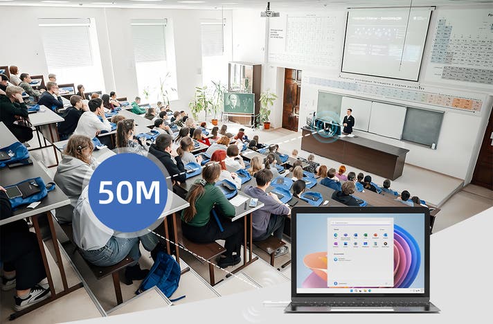 最新の高性能チップを採用し、驚きの最大50mの伝送距離を実現。大きな会議室や教室でも、教室の片側からもう片側まで安定してスムーズにワイヤレス伝送が可能です。ケーブル不要なので、機器の配置を気にせず自由に設置できます。