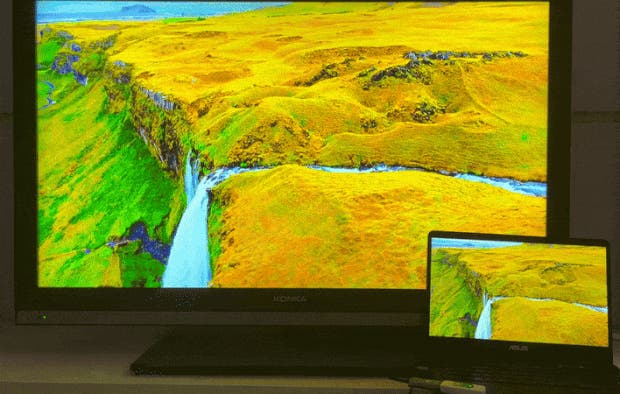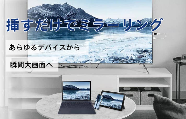 面倒な操作や長いケーブルは一切不要。スマホやノートパソコンの映像を、テレビやプロジェクターなどの大画面へ手軽にワイヤレス転送できます。