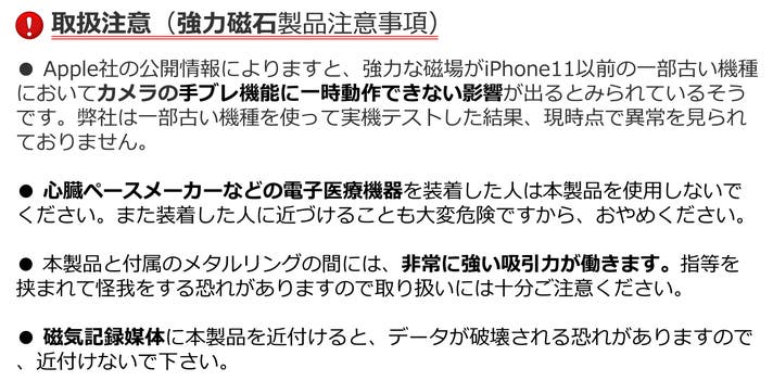 A. Apple社の公開情報によりますと、強力な磁場がiPhone 11以前の一部古い機種においてカメラの手ブレ補正機能に一時的に影響を与える可能性があるとされています。弊社が一部の古い機種を使用して実機テストを行った結果、異常は見つかりませんでした。