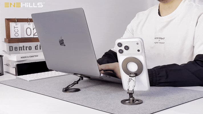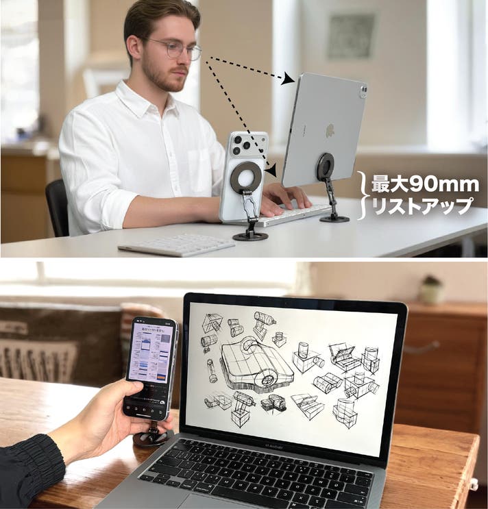 最大約90mmの高さ調整が可能で、ノートPC横に設置するだけで視線を揃え、作業姿勢を自然に整えてくれます。デスク上でスマートフォンやタブレットを見やすい位置に固定できるため、マルチタスク作業がよりスムーズに。