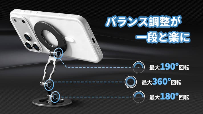 三軸ヒンジで“狙った角度”にピタッ。上部最大190°/中心360°回転/ベース180°。高トルク設計でタップしてもグラつかず、横・縦・俯瞰まで思いのまま。