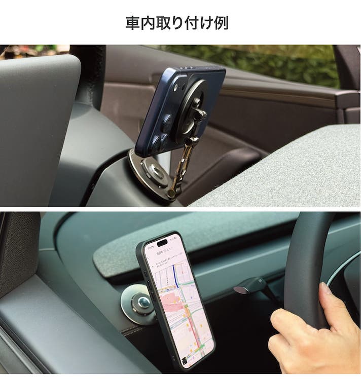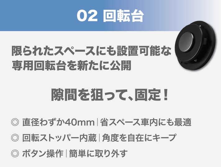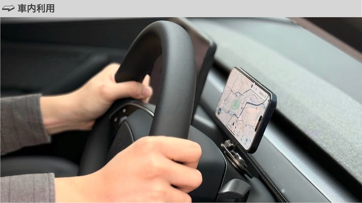 平面の少ない車内でもしっかり使える直径約40mmの回転台です。一般的なメタルプレートの代わりとして設置でき、限られたスペースでもDual Magic Ring Proを固定でき、ナビ利用や操作が快適に。スタイリッシュなデザインで車内の雰囲気を損なわずにご利用いただけます。
