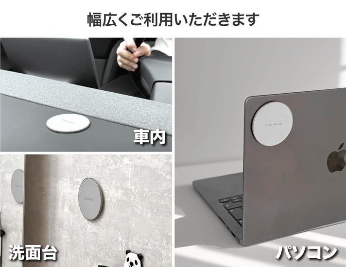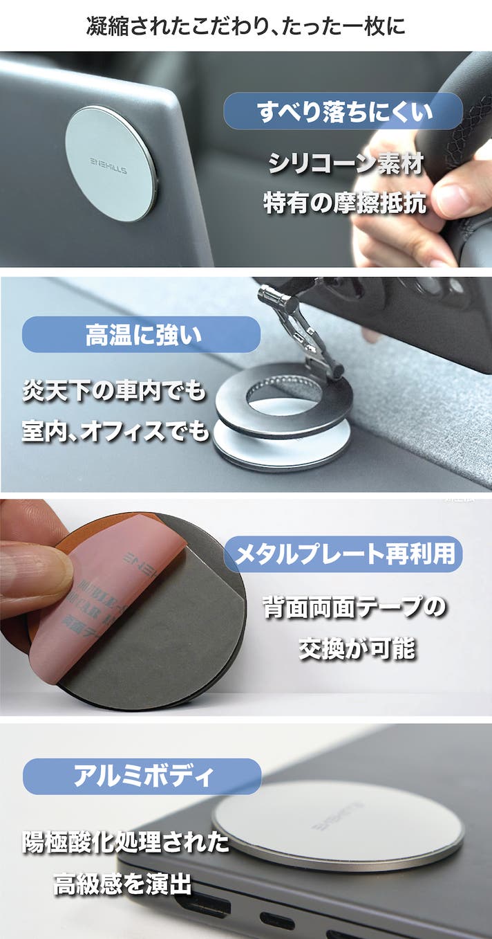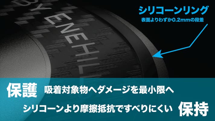 外周に0.2mm高く設計したシリコーンリングが、接触時の「第一接点」に。硬い物同士に直接当たらないため、スマホへの細かな擦り傷を最小限に抑えます。さらにシリコーン特有の高い摩擦力で滑りを防止し、滑らかな面でもしっかり保持。モニター背面・車内まで、保護+保持をシリコーンリングで実現します。