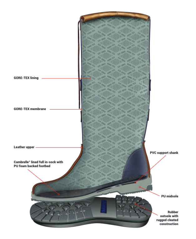 特徴は防水で透湿性が高く、スタイリッシュでクッション性に優れ、履き心地が良い柔らかさを持った本革のロングタイプのブーツ。
