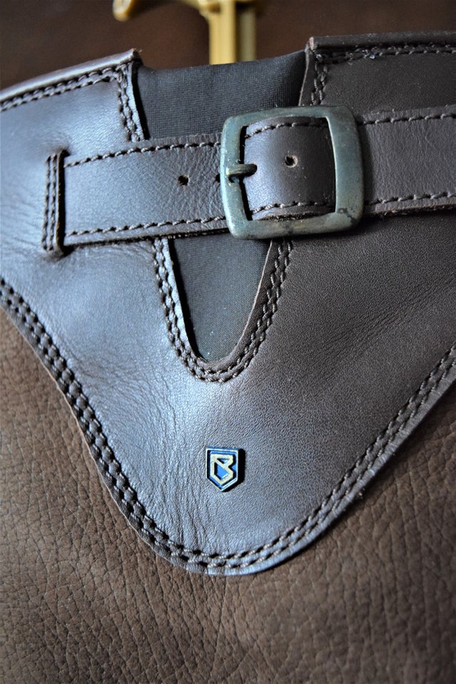 また履き口の横側にはレザーベルトが付いていて、その下地には伸縮素材ライクラを使用することでブーツの履き口の広さを調節出来ます。