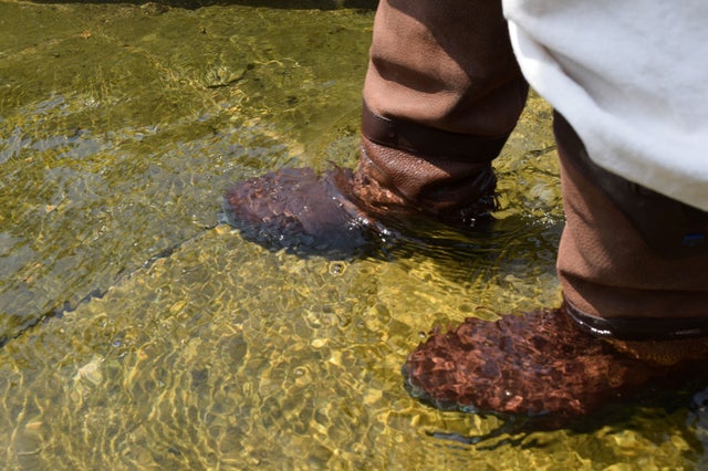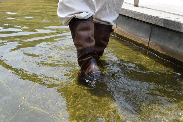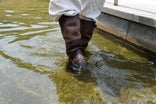 実際に水の中に入ってみると、この防水透湿性を実感することが出来ます。河や湖での用途は様々ですが、特に釣りやカヌー等でボートに乗り込む際の作業を助けてくれます。私達は膝下の深さまでを水から守られる事で、想像以上に行動範囲と操作性を広げることが出来ます。