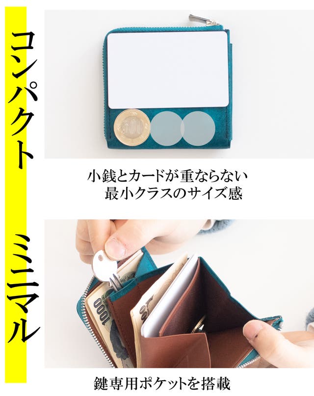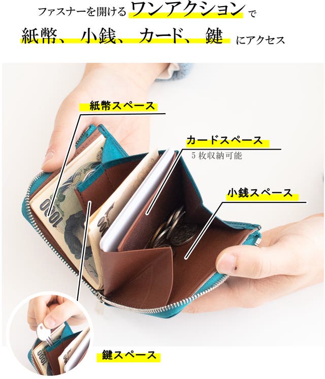- お札7枚 カード5枚 小銭15枚、鍵1本入って必要量はしっかり確保!