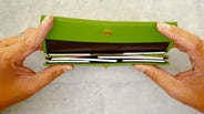 そこで中央付近に厚みが集中しないようにカードを横入れと縦入れに分けて収納することで厚みを分散させることに成功しました。