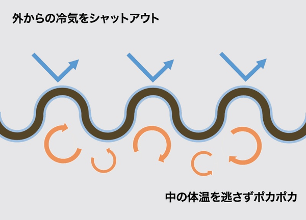 - 高い保温性の秘密:極細繊維を一本一本シリコンコーティング、冷気を通さず、体温逃さずでポカポカ
