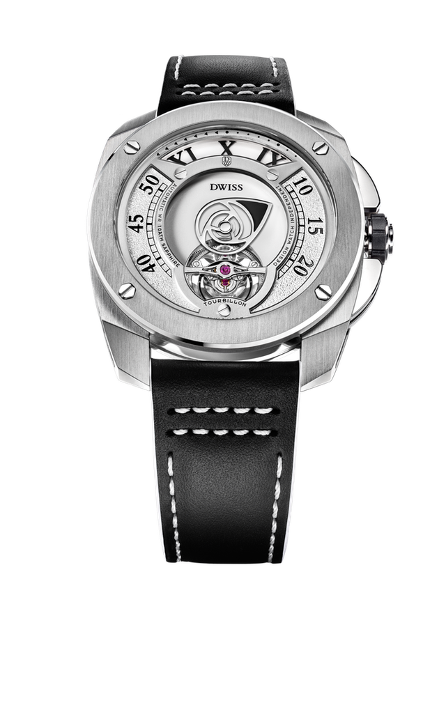 DWISS RC1トゥールビヨンは、革新的でデザイン賞を受賞した時間表示システムを備えたキャリバーConcepto 8950自動トゥールビヨンを使用しています。