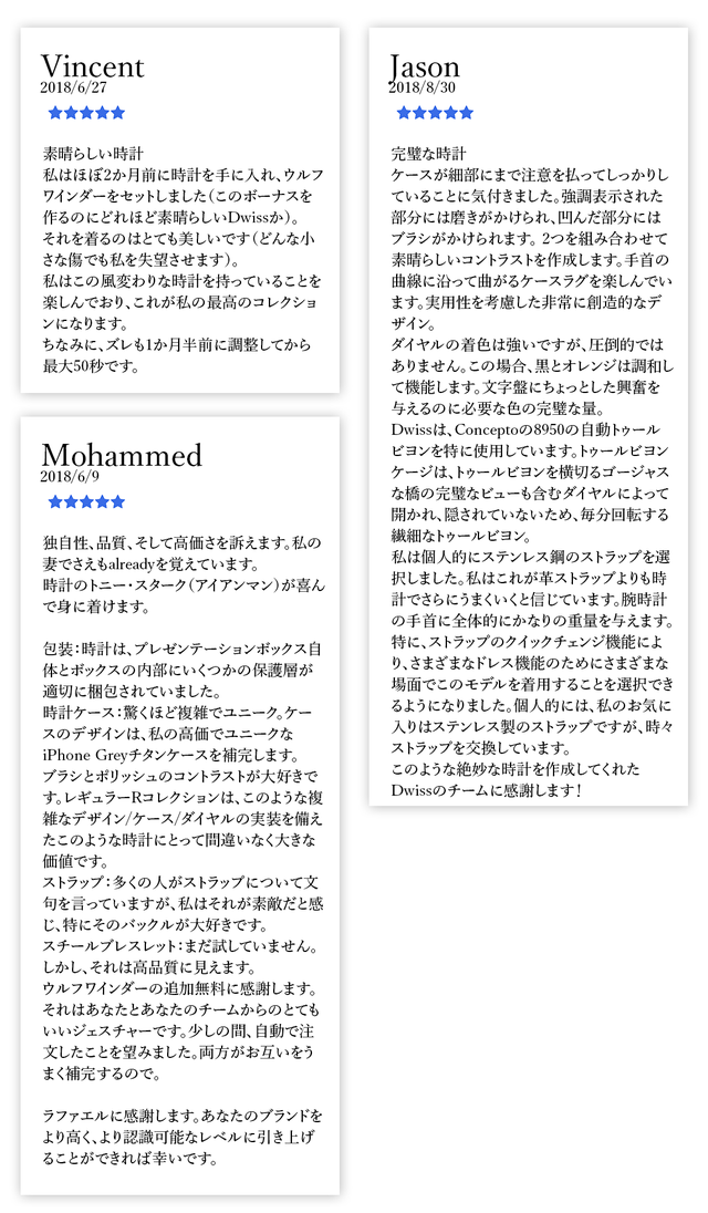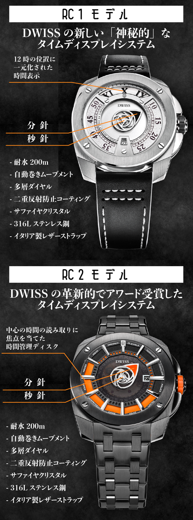 ひとつひとつがスイス製のオリジナルの限定版時計であり、独占的で革新的で受賞歴のある時刻表示システムを備えており、DWISSの署名となっています。