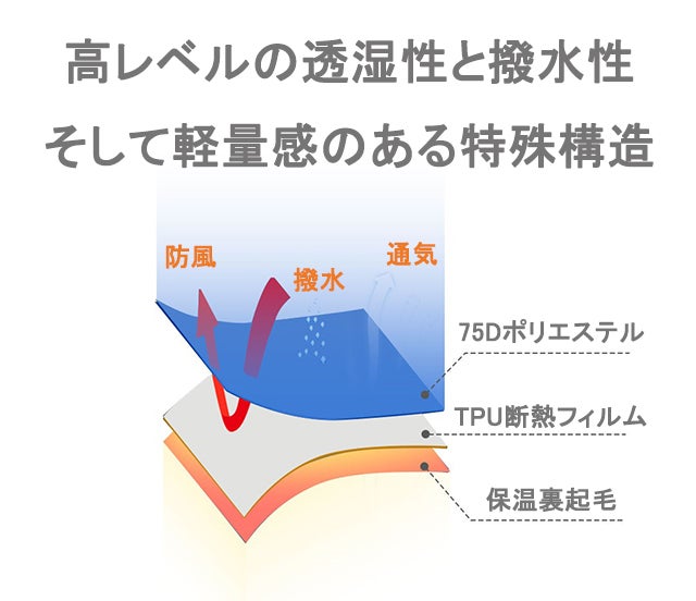 透湿性能と撥水性能に発揮する3層構造を採用し、侵入を防ぐと同時に水蒸気を外に逃がしてムレを防げるので、登山やスノースポーツといったアクティビティが快適に楽しめます。