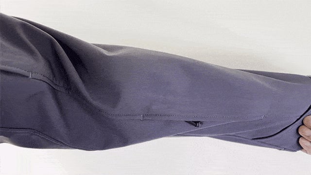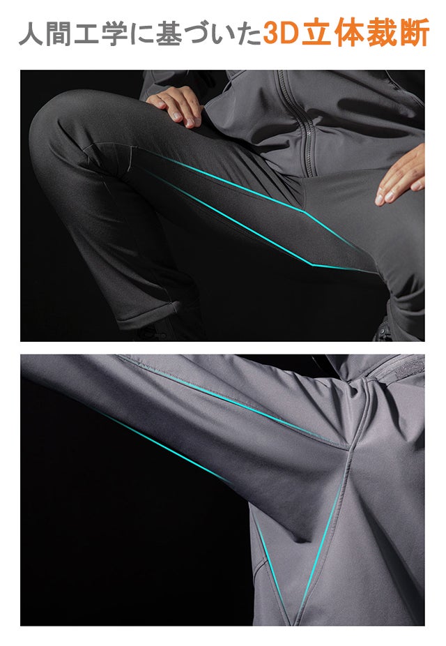 ズボンも同じように3D立体裁断で内股にマチ布を入れ、膝辺りから立体的にして、屈伸をしたり足を曲げたりする時に動きがスムーズで快適です。