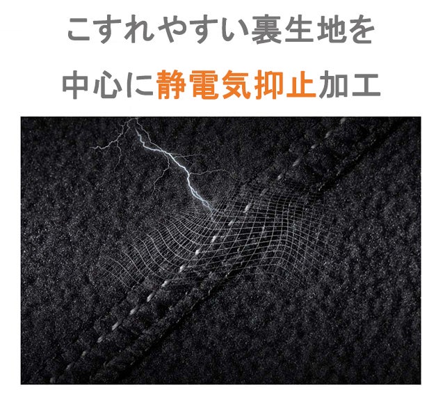 静電気抑止加工をしているため静電気が発生してもすぐに流れてたまりにくく、パチパチやまつわりつきを軽減してくれます。